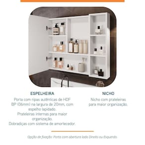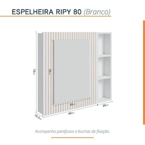 Espelho de 550 X 390 X 03 mm com acabamento lapidado, estruturado em porta com ripas autênticas de HDF BP (06mm). Possui prateleiras internas e porta com dobradiças slow, com sistema de amortecedor. Ao lado, acompanha Nicho de 20cm x 70cm, com prateleiras para maior organização. Acompanha tapa furos buchas de nylon parafusos para fixação na parede. Possui manual de instalação. Espelheira ideal para compor com os Armários e Gabinetes da marca BUMI MÓVEIS, e as Bancadas e Lavatórios da marca BLU LAVATÓRIOS (vide site do Madeira Madeira). Produto sai montado de fábrica, devidamente regulado, bastando apenas fixá-lo na parede. Garantia de 12 meses para defeito de fabricação. Acabamento da Porta: BP Acabamento da Prateleira: BP Altura do Espelho: 55 Ambiente Principal: Banheiro Composição: 80% de HDF BP e 20% de espelho Cor: Branco Cor do Produto: Branco Cor Interna: Branco Escala de Brilho: Acetinado Espessura do Espelho: 3 Formato do Espelho: Retangular Informações Complementares: Produto sai montado de fábrica, devidamente regulado, bastando apenas fixá-lo na parede. Itens Inclusos: 01 Espelheira Ripy 80cm Largura do Espelho: 39 Linha ou Coleção: Ripy Manual de Montagem e Instalação: https://product-hub-prd.madeiramadeira.com.br/896596/documents/b4f2d1e3-cfa4-4cef-acd4-f35eda9bb1981931680348617151088856647.pdf Material da Porta: MDF/MDP Material da Prateleira: MDF/MDP Material Principal: MDF/MDP Necessita Montagem: Não Origem do Produto: Nacional Peso: 14 kg Peso Máximo por Prateleira: 2 Possui Espelho: 01 Possui iluminação: Não Possui Portas: 01 Possui Prateleiras: 05 Possui Toalheiro: Não Possui Tomadas: Não Recomendações de Uso, Manutenção e Limpeza: Nunca utilizar produtos químicos. Use somente flanela levemente umedecida em água e em seguida uma outra seca e macia. Caso ocorra vazamento ou acúmulo de água no produto, enxugar imediatamente. Tipo de Dobradiça/Corrediça da Porta: Metálica Tipo de Fixação do Espelho: Parafusos Tipo de Porta: Bater Tipo de Puxador da Porta: Não Possui