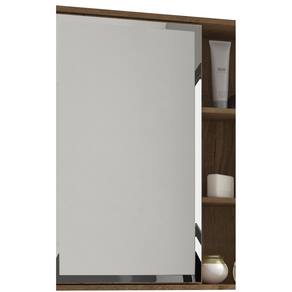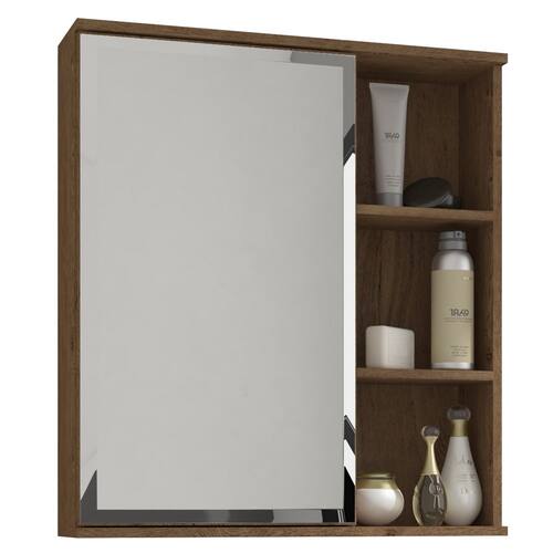 Espelheira para banheiro suspensa, com uma porta com espelho bisotado e abertura de porta com fecho toque, três prateleiras em MDF, estrutura 100% MDF, design moderno e amplo espaço.