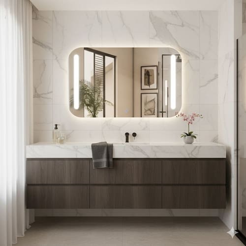 O Espelho Crys combina tecnologia e design para transformar seu ambiente. Com iluminação LED 6000K e sistema touch, oferece luz branca intensa, ideal para maquiagem e cuidados pessoais. Seu design moderno, com cantos arredondados e acabamento refinado, adiciona sofisticação e funcionalidade a banheiros, quartos ou lavabos, valorizando cada detalhe do espaço. Acompanha Lâmpada: 01 Altura do Espelho: 50 cm Ambiente Principal: Banheiro codigo_ean: 7900288278296 Coleção: Crys Composição: 80% Espelho, 5% Fitas de Led, 5%EVA, 5%Suporte,5% Botão Touch Cor: espelho lapidado Cor do Produto: Espelho Lapidado Cor Interna: Branco Escala de Brilho: Fosco Espessura do Espelho: 3 mm Espessura do Material da Estrutura: 3 mm Formato do Espelho: Retangular Formato Espelheira: Retangular Informações Complementares: Espelho com iluminação direta e 1 cor de Led integrado Itens Inclusos: 1 Espelheira e Kit Instalação Largura do Espelho: 70 cm Linha ou Coleção: Crys Manual de Montagem e Instalação: https://product-hub-prd.madeiramadeira.com.br/892195295/documents/e3f6f8a3-51d7-4476-80ee-70ba726480693280948648917609770598857.pdf Marca: Reduna Material Principal: Espelho Necessita Montagem: Não Origem do Produto: Nacional Peso: 2,8 kg Possui Espelho: 01 Possui iluminação: Sim Possui Portas: Não Possui Prateleiras: Não Possui Toalheiro: Não Possui Tomadas: Sim Recomendações de Uso, Manutenção e Limpeza: Limpar com pano macio e úmido, sem uso de produtos abrasivos Tipo de Fixação do Espelho: Parafusos Tipo de Lâmpada: Led undefined: 266415102 Voltagem da Tomada: Bivolt