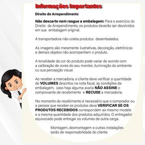 O cliente deve verificar a quantidade de VOLUMES descritos na nota, as condições da embalagem, caso haja algum dano NÃO ASSINE o comprovante de recebimento e RECUSE a mercadoria.