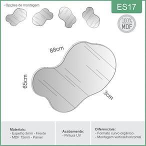 Com um design contemporâneo, o Painel Decorativo Orgânico é perfeito para ampliar visualmente qualquer ambiente. Confeccionado inteiramente em MDF, este painel possui uma pintura com 6 camadas de proteção, assegurando um acabamento de alta qualidade. O espelho, com seu formato orgânico, é uma peça central que se destaca em qualquer espaço. Suas dimensões generosas adicionam um toque de elegância à decoração da sua casa, conferindo-lhe um caráter único. O produto já inclui os suportes necessários para a fixação na parede. CARACTERÍSTICAS TÉCNICAS: - Produzido em MDF de 9 e 15 mm - Acabamento em Pintura UV na cor Preto - Espelho com 3 mm de Espessura DIMENSÕES: Altura: 65 cm Largura: 88 cm Profundidade: 3 cm Peso: 6,9 kg INFORMAÇÕES ADICIONAIS: - ATENÇÃO: Não trabalhamos e não nos responsabilizamos pela montagem do móvel. Antes da montagem conferir se o produto está de acordo com o que comprou, produto montado e danificado pela montagem não será aceito troca. Montagem e instalação por conta do comprador. - As imagens ambientadas são meramente ilustrativas e podem apresentar itens que não compõe o produto. As cores do produto podem variar de acordo com o monitor, a iluminação do ambiente ou sua percepção visual. - Limpeza: Deve ser feita com pano macio e seco ou levemente umedecido com água e sabão neutro. Não devem ser utilizados abrasivos como palha de aço e objetos cortantes.