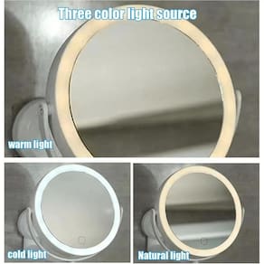 Espelho Giratório Dupla Face, 1 lado normal e outro com 5x aumento 42 luzes LEDs 3 Tons de Luminosidade Branco Frio, Branco Misto e Branco Quente Espelho com Botão Touch na parte frontal para Ligar e Desligar as funções Bateria Recarregável Tempo de Carregamento Aproximadamente 2h Bateria varia de acordo com o uso Capacidade da bateria: 1200 mAh Bivolt Fácil de Instalar Cabo USB Não acompanha adaptador de tomada Gancho na ponta do suporte para pendurar esponja e produtos pequenos e leves Fita Autocolante Não precisa furar a parede Cor: Branco Material: Polipropileno e Componentes Eletrônicos
