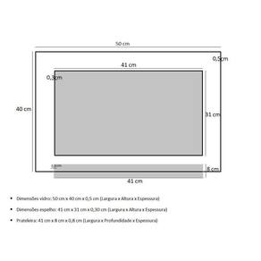 Espelho para banheiro com prateleira 50cm x 40cm mármore preto dourado Os nossos espelhos são ideais para banheiros e lavabos trazendo um toque especial no projeto de decoração e proporcionando um design moderno e arrojado no ambiente. Além da elegância, sofisticação e praticidade tem a qualidade e a durabilidade indiscutível, pois todos os itens podem molhar que não irá danificar, a pintura do vidro é feita na mais moderna impressão em alta definição com texturização, garantindo que matenha os detalhes da impressão ao longo dos anos, os suportes da prateleira e as tampas dos parafusos são de inox, mais uma garantia de excelência da qualidade desse produto. Itens inclusos: - vidro temperado com impressão em alta definição: 50 cm x 40 cm largura x altura - espelho: 41 cm x 31 cm x largura x altura - prateleira: 41 cm x 8 cm largura x profundidade - kit parafusos completo para instalação Espessuras: - vidro temperado com impressão em alta definição: 5 mm - espelho: 3 mm - prateleira: 8 mm Montagem: montagem e instalação não inclusa na venda ou preço do produto, elas são de inteira responsabilidade do cliente. Atenção: o espelho já vai fixado no vidro. Imagens ilustrativas.