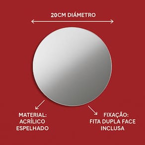 Modelo: Espelho decorativo redondo Material: Acrílico espelhado Diâmetro: 20 cm Fixação: Fita dupla face (inclusa) Uso: Parede ou base expositora Dicas de Uso Use na parede para ampliar ambientes pequenos. Utilize como base para joias e acessórios, criando composições sofisticadas. Para limpeza, use apenas pano macio e seco.