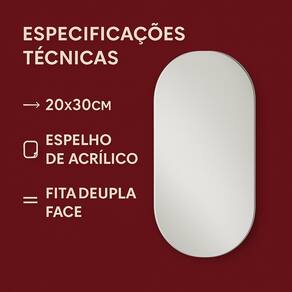 Benefícios Instalação prática com fita dupla face inclusa Leve, seguro e resistente Versátil: uso como espelho ou base expositora Design moderno no formato pílula (20x30 cm)