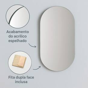 Especificações Técnicas Modelo: Espelho decorativo formato pílula Material: Acrílico espelhado Medidas: 20 x 30 cm Fixação: Fita dupla face inclusa Uso: Parede ou base expositora