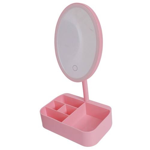 Iluminação LED para melhor visualizaçãoEspelho redondo com design modernoBase com divisórias para organizaçãoPortátil e leve, fácil de transportarDisponível nas cores rosa e brancoConteúdo da embalagem