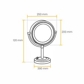 Diâmetro do espelho: 250 mm Altura do espelho: 200 mm Base: 390 mm Altura total: 120 mm