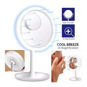 - Material: Polipropileno e Componentes Eletrônicos. - Alimentação: por cabo USB ou com 4 Pilhas AA 1.5v Não incluso . - Voltagem: 5v. - Quantidade de LED: 40 LED. - A Função Ventilador possui 3 Velocidades. - Possui 2 tipos de espelho, o maior que tem a visão normal e o menor que tem um aumento de 5x para te ajudar naquele detalhe. - Espelho com Botão Touch Screen na parte frontal para Ligar e Desligar as funções. - Possui base removível - O espelho possui um espaço na base para você deixar os seus produtos de maquiagem acolhidos enquanto os usam.