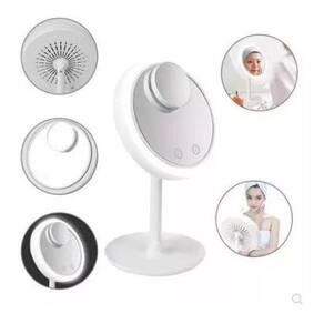 - Material: Polipropileno e Componentes Eletrônicos. - Alimentação: por cabo USB ou com 4 Pilhas AA 1.5v Não incluso . - Voltagem: 5v. - Quantidade de LED: 40 LED. - A Função Ventilador possui 3 Velocidades. - Possui 2 tipos de espelho, o maior que tem a visão normal e o menor que tem um aumento de 5x para te ajudar naquele detalhe. - Espelho com Botão Touch Screen na parte frontal para Ligar e Desligar as funções. - Possui base removível - O espelho possui um espaço na base para você deixar os seus produtos de maquiagem acolhidos enquanto os usam.