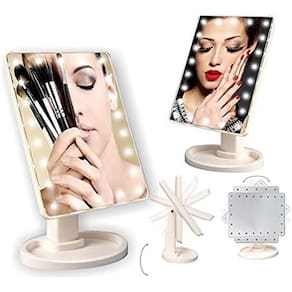 Espelho de maquiagem com 16 leds touch usb botão touch Espelho de mesa articulável para makes com 16 leds botão touch Espelho de mesa giratório, com botão smart touch, possui base para guardar seus acessórios, botão com liga/desliga, cabo usb e compartimento para 4 pilhas. Ideal para maquiagem, limpeza de pele, colocação de , iluminação perfeita para seus momentos de make e skin care. Através da iluminação via 16 lâmpadas led, a pele fica muito mais iluminada e melhor definida. O mesmo gira 180º graus para que você obtenha um ângulo perfeito de visualização de seu rosto. O espelho funciona com pilha, e também conectado no cabo usb não acompanha fonte . Alimentação: 4 pilhas aa não inclusas ou cabo usb. Dimensões do espelho: 22x16cm Peso: 385g Composição do material: polipropileno Sistema: 180º graus. Itens inclusos: 1 espelho 1suporte 1cabo usb Marca: Não Informado Ean: 7893095628784