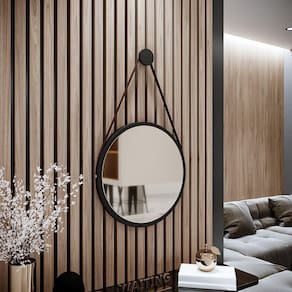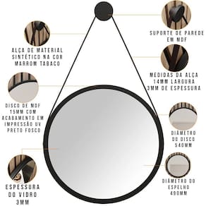 Imagine uma peça unânime para qualquer estilo de decoração? Este item que é capaz de mudar a identidade do seu ambiente! O espelho torna ambientes pequenos em mais amplos, além de também auxiliar na estética e clareza. Que tal inovar na sua decoração usando o espelho Nix? Produzido com alças em Couro Sintético, garantindo a sustentação do item na sua decoração. Leve já o seu! Dimensões do produto (L x A x P). 54 x 95 x 18 mm. Características do Produto: Disco de MDF 15 com acabamento em impressão UV Preto Fosco. Diâmetro do Disco: 540mm. Diâmetro do Espelho: 490mm. Material do Espelho: Vidro. Alça de material sintético, cor marrom tabaco. Acompanha suporte de parede. Observações importantes: Produto para uso residencial em ambiente interno, não devendo ficar exposto diretamente ao sol, calor e umidade excessivos. Pode haver alguma diferença de tonalidade entre a imagem e o produto real, por conta do tratamento de imagens e a calibração de cores do seu monitor. As imagens são meramente ilustrativas, não acompanham objetos de decoração e eletrônicos. Ao receber a mercadoria, o cliente deve verificar as condições da embalagem, caso haja alguma avaria não assine o comprovante de recebimento. Montagem, desmontagem e outras instalações serão de responsabilidade do cliente. Não nos responsabilizamos, no ato da entrega, por subir escadas/elevadores ou pelo transporte por guincho em apartamentos. Eventuais despesas são de responsabilidade do comprador. Confira as dimensões do produto e certifique-se de que passará normalmente por supostos elevadores, portas, escadas e/ou corredores de sua residência.