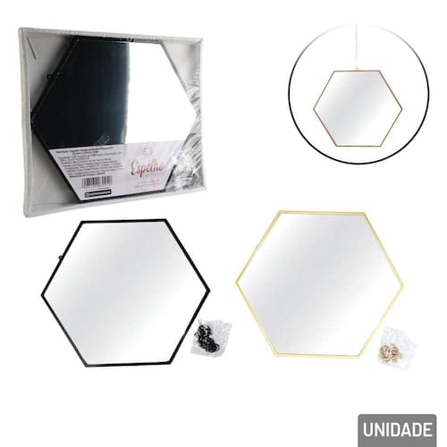 Espelho Hexágonal 25x22cm Decorativo Color - Ideal para renovar de maneira prática, o espelho é um grande aliado quando a intenção é proporcionar amplitude ao ambiente;\n- Com design no estilo industrial, que é perfeito para quem busca valorizar o espaço com propostas autênticas e que agregam soluções estéticas ao espaço;\n- Disponível nas cores: Rose, Dourado e Preto;\nEspelhos:\nMarca : C3B\nTipo de material : Plástico, Vidro\nCores ou Estampa : Color\nDimensões do Produto : 22 X 25 X 1,5 CM\nDimensões da Embalagem : 23 X 26,5 X 2 CM\nPeso Bruto (Gramas) : 0.260 Marca: Não Informado
