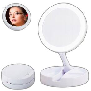 Além de ter um design elegante, este espelho de maquiagem com dupla face é iluminado com LEDs, sendo muito prático. Basta pressionar um botão na parte inferior do suporte para ligar as luzes LED.
