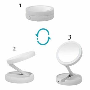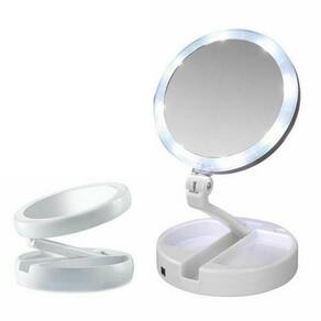 Este espelho, é feito para você mulher que mesmo na correria cotidiana, sempre arruma um tempinho para retocar a maquiagem ou arrumar o cabelo. Por ser Dobrável, leve e compacto, ocupa pouco espaço, sendo ideal para guardar na bolsa, na mala de viagem e até mesmo em casa e estende-se para um máximo de 13 De altura. Além de ter um design super elegante, este espelho de maquiagem com dupla face, é iluminado com leds, sendo muito prático, basta pressionar um botão na Parte inferior do suporte, que ligará as luzes led, as luzes de led são super brilhantes em ambos os lados para iluminação perfeita da imagem. O mesmo gira e se Transforma em um poderoso espelho de ampliação que aumenta em 10x a imagem.