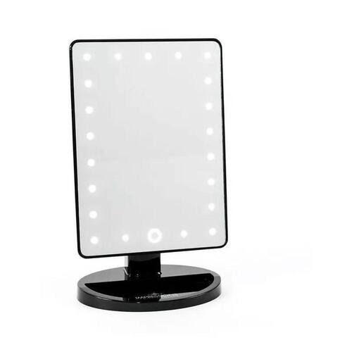 Especificações: Utiliza 4 pilhas aa não inclusas . Medidas do espelho: 22 x 16cm Altura com suporte: 26,5cm Profundidade 1,6 cm Material: plástico, vidro e componentes eletrônicos. Cores: Preto Instruções de conservação: limpar com pano umedecido. Não use químicos e abrasivos.