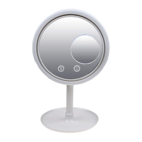 Espelho de maquiagem led com ventilador + mini espelho de aumento 5x com ventosaEste é o engenhoso espelho de maquilhagem com um ventilador embutido que sopra uma brisa refrescante, secando a maquiagem à medida que você se aplica e isso significa uma aplicação de maquiagem sem suorCaracterísticas do produto:O ventilador embutido ajuda a secar a maquiagem e reduzir a transpiraçãoA luz de anel led fornece iluminação suave com qualidade de estúdioEspelho de tamanho grande de 20 cm sem distorçãoEspelho de detalhe destacável bônus com ampliação de 5xBase ampla da bandeja de exibição para armazenar objetos de valorToque nos botões do sensor para acender a luz do anel led, ventilador de refrigeração ou ambosO espelho funciona tanto no cabo usb quanto a pilha aa;Especificações do produto:Material: polipropileno e componentes eletrônicos.Alimentação: liga por usb ou com 4 pilhas aa 1.5v não incluso .Voltagem: 5v.Quantidade de led: 40 led.A função ventilador possui 3 velocidades.Possui 2 tipos de espelho, o maior que tem a visão normal e o menor que tem um aumento de 5x para te ajudar naquele detalhe.Espelho com 40 luzes de led frontal.Espelho com botão touch screen na parte frontal para ligar e desligar as funções.Possui base removívelO espelho possui um espaço na base para você deixar os seus produtos de maquiagem acolhidos enquanto os usam.Conteúdo da embalagem:1 - espelho visão normal.1 - mini espelho visão aumentada 5x.1 - cabo usb somente o cabo
