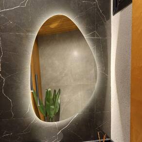 O espelho possui design orgânico com acabamento lapidado e iluminação em LED, disponível em duas opções de cor: branco frio ou branco quente.