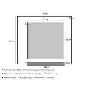 Espelho para banheiro com prateleira 40cm grafite Os nossos espelhos são ideais para banheiros e lavabos trazendo um toque especial no projeto de decoração e proporcionando um design moderno e arrojado no ambiente. Além da elegância, sofisticação e praticidade tem a qualidade e a durabilidade indiscutível, pois todos os itens podem molhar que não irá danificar, os vidros são pintados com tinta de alta performance, o que lhe garante a permanência da cor . Os suportes da prateleira e as tampas dos parafusos são de inox, mais uma de excelência da qualidade desse produto. Itens inclusos: - vidro temperado colorido: 40 cm x 40 cm largura x altura - espelho: 31 cm x 31 cm x largura x altura - prateleira: 31 cm x 8 cm largura x profundidade - kit parafusos completo para instalação Espessuras: - vidro temperado: 5 mm - espelho: 3 mm - prateleira: 8 mm Montagem: montagem e instalação não inclusa na venda ou preço do produto, elas são de inteira responsabilidade do cliente. Atenção: o espelho já vai fixado no vidro. Imagens ilustrativas.