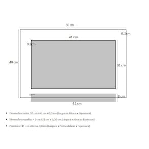 Espelho para banheiro com prateleira 50cm champanhe Os nossos espelhos são ideais para banheiros e lavabos trazendo um toque especial no projeto de decoração e proporcionando um design moderno e arrojado no ambiente. Além da elegância, sofisticação e praticidade tem a qualidade e a durabilidade indiscutível, pois todos os itens podem molhar que não irá danificar, os vidros são pintados com tinta de alta performance, o que lhe garante a permanência da cor . Os suportes da prateleira e as tampas dos parafusos são de inox, mais uma de excelência da qualidade desse produto. Itens inclusos: - vidro temperado colorido: 50 cm x 40 cm largura x altura - espelho: 41 cm x 31 cm x largura x altura - prateleira: 41 cm x 8 cm largura x profundidade - kit parafusos completo para instalação Espessuras: - vidro temperado: 5 mm - espelho: 3 mm - prateleira: 8 mm Montagem: montagem e instalação não inclusa na venda ou preço do produto, elas são de inteira responsabilidade do cliente. Atenção: o espelho já vai fixado no vidro. Imagens ilustrativas. Marca: Não Informado