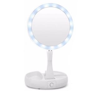 Com um design articulado, este espelho de vaidade iluminado possui dois lados, sendo um com ampliação de 10x e outro com ampliação de 1x. Além disso, ele dobra e gira para facilitar o uso e o armazenamento.