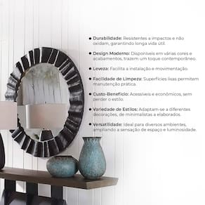 Versatilidade para qualquer ambiente: Com um acabamento de pintura de alta resistência, esse espelho é perfeito para locais úmidos, como o banheiro. Sua evidência é evidenciada pelo encaixe na estrutura, permitindo a instalação tanto na horizontal quanto na vertical, adaptando-se perfeitamente ao seu espaço.