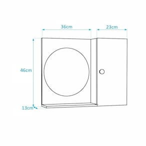 Suas medidas totais são: 58cm de Largura x 46cm de Altura x 13cm de Profundidade. O espelho mede: 33cm diâmetro. Peso: 7,5kg.