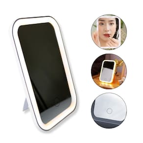 Características principais: - 3 cores de led; - botão touch discreto; - espelho com perfeito acabamento; - cor branca; - leve e compacto; - versátil; - acompanha cabo para carregar; - possui haste para ficar de pé.
