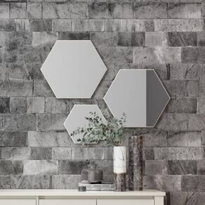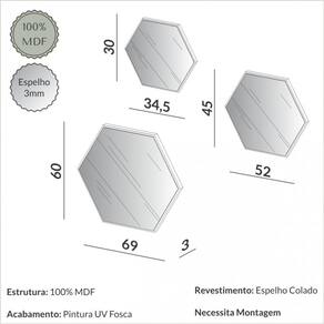 Todas as peças são produzidas 100% em MDF, com pintura de 6 camadas de proteção, o que lhes confere alta qualidade de acabamento. O conjunto ES13 possui 3 painéis decorativos em formato hexagonal e são peças chave para qualquer ambiente. Com proporções coringas, os espelhos são destaque para qualquer ambiente e conferem um design elegante para completar a decoração com exclusividade e personalidade.