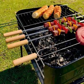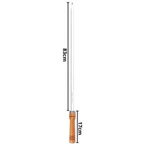 Diferenciais: o espeto se destaca pelo acabamento em alumínio polido de alta qualidade, aliado a um cabo de madeira que proporciona conforto térmico e um toque sofisticado. Sua estrutura simples, mas robusta, o torna indispensável em qualquer conjunto de utensílios de churrasco.