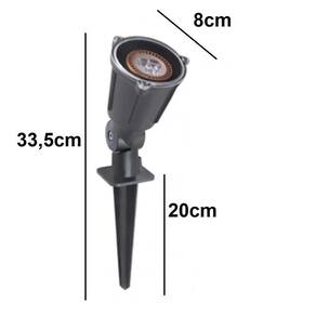 Tipo de lâmpada: led gu10 - potência máxima 10w Tipo de soquete: gu10 Cor: verde Comprimento total: 33,5cm Comprimento da haste: 20cm Diâmetro: 8cm Tensão: 127-220v Soquete em porcelana; Marca: olivo Produto: espeto de jardim Tipo de material: plástico - nylon Quantidade de lâmpadas: 1 Com sensor de movimento: não É à prova d'água: sim Contém lente de vedação em policarbonato na cúpula onde é inserida a lâmpada;