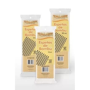 Descrição e Características: Espetos roliços fabricados em bambu asiático. Produto altamente sustentável e de baixo impacto ecológico. Especificações, quantidade na embalagem e código do produto:
