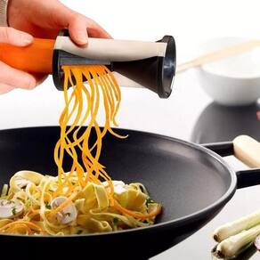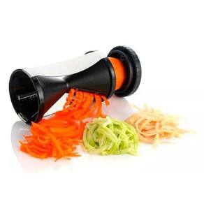 Com o fatiador espiral você pode fazer corte julienne em legumes e vegetais. As espirais de 2x3mm e de 3,5x5mm são perfeitas para criar massas de vagetais e decoração nos pratos a servir. A combinação de plástico de qualidade e aço inoxidável faz com que seja fácil a limpeza. Ideal para legumes e vegetais de 20mm a 54mm de diâmetro. Use sua criatividade e surpreenda na cozinha