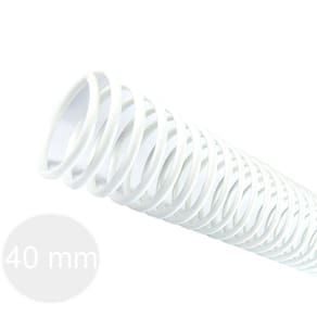 Espiral para Encadernação Branco 40mm 350 Folhas 20 und - Espiral plástico Colorido fabricado em PVC Semi-Rígido. - Diâmetro de 40mm para encadernar 350 folhas (24 kg / 75gr), com comprimento de 33cm. - Fio de 2,6mm. - Utilizado para encadernação de diversos fins, tais como apostilas, listas de preços, relatórios, cadernos, agendas, livros didáticos e etc. - Pacote acompanha 20 unidades de espirais branco. Produto plataforma Plast.