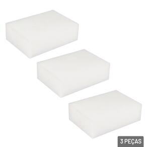 Esponja Mágica de Melanina Limpeza 3 Peças Transforme a forma como você cuida da sua casa com a Esponja Mágica de Melanina, uma solução prática, eficaz e sem necessidade de produtos químicos! Composta por espuma de melamina de alta densidade, essa esponja inovadora remove até as sujeiras mais difíceis apenas com água. Ideal para quem busca eficiência e praticidade na rotina de limpeza.\nNão é necessário usar detergentes ou produtos químicos. Basta umedecer a esponja e esfregar suavemente. Excelente para limpar paredes, rodapés, portas, interruptores, tênis, móveis, eletrodomésticos, azulejos, plásticos, couro sintético e até manchas em calçados e canetas em mesas escolares.\nEspecificações:\nMarca : MUTTI\nTipo de material : Melamina\nCores ou Estampa : Branca\nDimensões do Produto : 21 X 10 X 3 CM\nDimensões da Embalagem : 21 X 10 X 3 CM\nPeso Bruto (Gramas) : 0.001 Marca: Não Informado