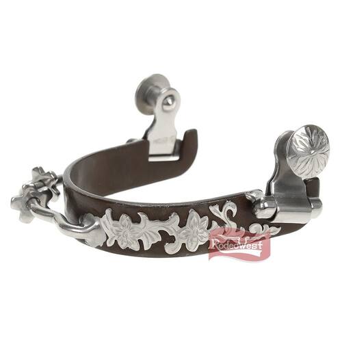 Par de esporas Metalab importadas modelo Caf Floral Bumper Spur fabricadas em aço cor marrom, garfo trabalhado com chapas em prata de 3/4" (1,90cm) de largura e hastes diferenciadas, mais leves e com 2 rosetas posicionadas estratégicamente permitindo que o cavaleiro exerça a pressão no animal sem necessidade de virar o pé, o que difere de esporas tradicionais, rosetas de 5 pontas.
