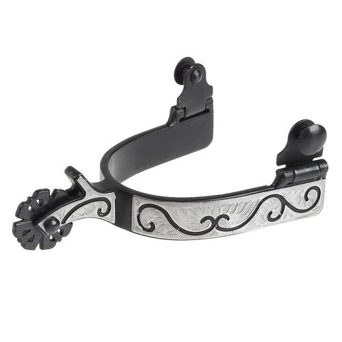 Espora Metalab Level 3 fabricada em metal, possui cão reto, garfo com detalhes laterais em metal trabalhado e roseta de 8 pontas.