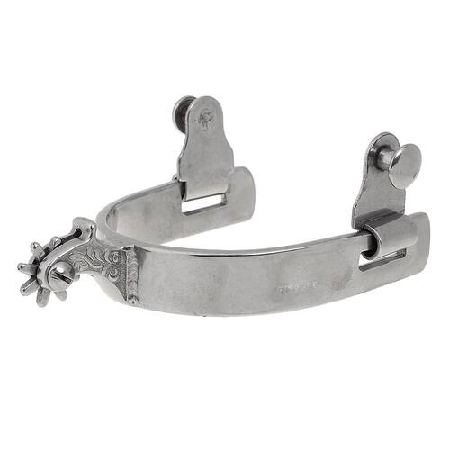 Espora Vinagre modelo Topete fabricada em Aço Inox. Possui cão com detalhes gravados na lateral e roseta de 8 pontas.
