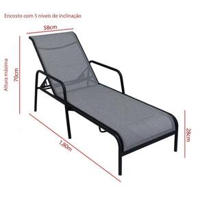 58cm de largura x 180cm de profundidade x 28cm de altura do chão ao assento (encosto com 5 níveis de inclinação)