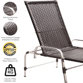 Espreguiçadeira Catar: - Altura: 37 cm - Largura: 62 cm - Profundidade: 195 cm - Suporta até 200 kg - Com regulagem