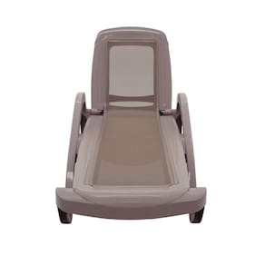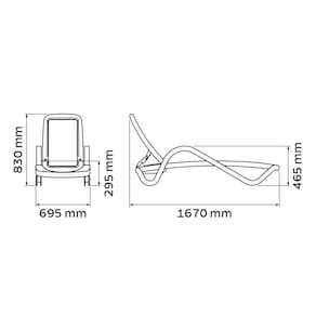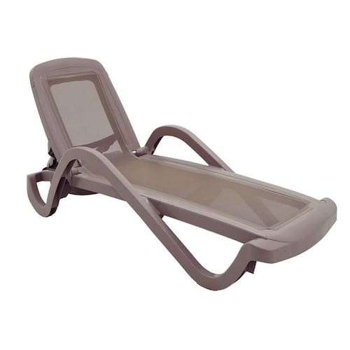Peso Máximo Recomendável: 140 kg. Material: Resina de polipropileno injetado.Tela: PVC e poliéster com proteção anti-uv.Empilhável até: 10 peças. Inclina até: 4 posições.Com Compartimento e Rodas.Resina Reciclável.