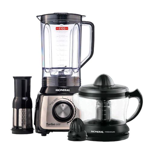 Espremedor De Frutas 25W + Liquidificador 1200W Preto 127V Mondial Espremedor De Frutas Laranja Leve mais praticidade e muito mais charme para sua cozinha. Além de possuir design moderno e motor reversível, o Espremedor de Frutas da Mondial conta com capacidade de 1250ml para você espremer seu suco preferido. Ficha Técnica Características do Produto: -jarra com 1,25L-design moderno-cone extrator extra para limão-guarda-fio-voltagem 127V-potência 30W-consumo 0,008Kw/h Com o Liquidificador Mondial Premium 110V você pode ter um dia a dia muito mais prático e saudável Entre as inúmeras vantagens dele está no filtro, acessório que acompanha o produto. Ele retém a semente e o bagaço evitando assim o uso de coador em sucos da sua fruta preferida e no preparo de molho de tomate. Com potência de 1200W, 12 velocidades e a função PULSAR são perfeitas para diversos tipos de alimentos, até mesmo os mais duros são fatiados facilmente. Com o Liquidificador Mondial Premium você pode triturar gelo e alimentos sólidos. Isso porque sua faca em aço inox serrilhada é bem afiada e resistente. O Liquidificador ainda conta com copo dosador com capacidade de 3L e tampa com orifício que permite a inclusão de alimentos durante o preparo, garantindo a certeza de qualidade, eficiência e bom gosto à sua cozinha