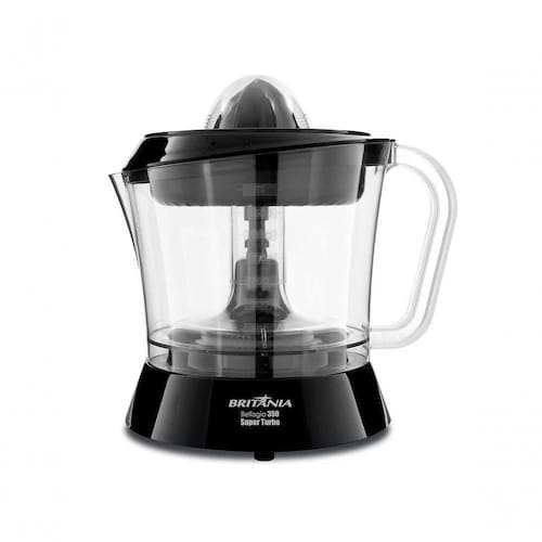Descricao O Espremedor de Frutas Britania Bellagio 350 Super Turbo e compacto e eficiente para voce ter na sua cozinha e nao deixar de fazer aquele suco delicioso, nutritivo e cheio de vitamina C para aumentar a imunidade da sua familia.Sao 35W de potencia e 2 cones de diferentes tamanhos que quando pressionados com a fruta giram para ambos os lados e extraem o suco todo da fruta, com aproveitamento maximo.A jarra de super capacidade de 1,5L permite que prepare suco para familia toda. Ela e transparente tem peneira e com graduacao de medidas, assim voce sabe o quanto de suco e tem.CaracteristicasPotencia de 35W.Encaixe rapido e pratico da jarra.2 Cones com dupla rotacao2 Cones: um maior para alimentos como laranja e um menor para alimentos como limaoAcionamento automatico por pressao.Tampa transparente de facil manuseio.Jarra transparente com graduacao.Super Capacidade da jarra 1,5 litros. Possui Peneira.Porta-fio.Baixo nivel de ruido.*Imagens meramente ilustrativas.Especificacao Tecnica Altura: 25,00cmLargura: 24,50cmProfundidade: 19,00cmPeso: 870,00gCapacidade da jarra (L): 1,5Cor: PretoMarca: BritaniaPotencia (W): 35Acionamento: AutomaticoRotacao: Dois sentidosVelocidades: 1