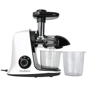 Espremedor de frutas West Bend com tecnologia de prensa a frio, motor silencioso, função reversa anti entupimento e 150W de potência.