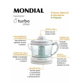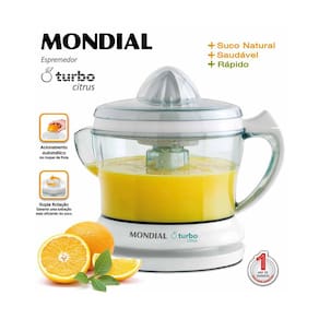 O Espremedor de Frutas Mondial Citrus E01 é perfeito para preparar um suco fresquinho e saudável de forma rápida e prática. Possui motor síncrono superpotente e jarra com capacidade para 1,25 litros transparente, para facilitar a visualização. Além disso, o espremedor de frutas Mondial conta com acionamento automático com motor reversível, que permite que você esprema seu suco de forma rápida, sem sujeira e com o máximo de aproveitamento.O equipamento conta com guarda-fios, que mantém tudo organizado, além de design compacto, que se acomoda perfeitamente em qualquer lugar. A peneira é ideal para espremer as mais diversas frutas, e ainda vem com uma tampa. Suas peças são desmontáveis para facilitar na hora da limpeza.Comer Bem e SaudávelMesmo com a rotina agitada, prezar pela sua saúde é prioridade. Ter à mão os eletroportáteis ideais é uma ótima forma para agilizar o preparo de sucos. Com o Espremedor de Frutas Mondial Citrus E01 você prepara sucos de forma ágil e eficiente, otimizando seu tempo para outras atividades do dia a dia sem deixar de cuidar da sua alimentação.