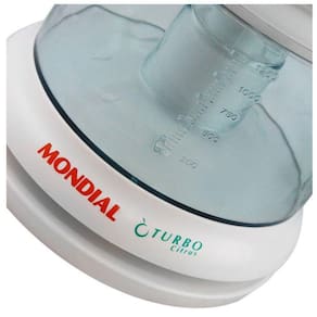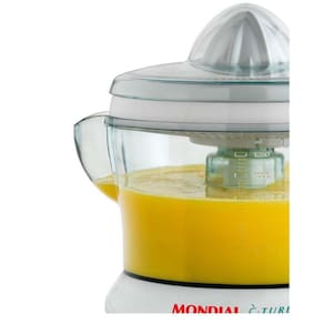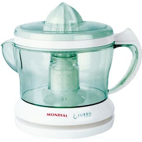 Características: Marca: Mondial Modelo: E-01 Material: PP Tipo de espremedor: Automático Indicado para: espremer frutas. Velocidades: 1 Potência: 25 Watts. Jarra: 1,25 litro. Tampa: sim Peneira: Sim Recursos: Proteção contra poeira: Sim Porta fio: Não Trava de segurança: sim Desmontável: Sim Consumo aproximado de energia: 0,05 kW/h. Bico: sim. Silencioso: sim. Cones de extração: 1 Alça: sim