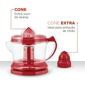 O Espremedor Turbo Citrus Red Premium Mondial faz sucos deliciosos de forma rápida e preserva o frescor da fruta. A capacidade de 1,25 litros produz bastante suco e basta pressionar a fruta no espremedor para acionar o equipamento. Acompanha cone extra para você escolher seu suco favorito, com o máximo rendimento. Conta ainda com dupla rotação e tampa de proteção.