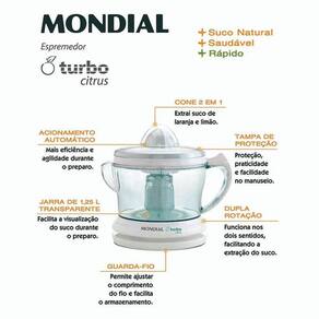 O Espremedor Turbo Citrus E-01 da Mondial possui design moderno com acionamento automático, guarda fios, jarra transparente com capacidade de 1,25 litros que vai diretamente à mesa e é desmontável para facilitar a limpeza e para a segurança da sua família possui trava.