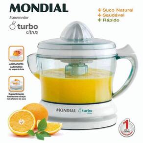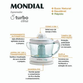 O Espremedor Turbo Citrus E-01 da Mondial possui design moderno com acionamento automático, guarda fios, jarra transparente com capacidade de 1,25 litros que vai diretamente à mesa e é desmontável para facilitar a limpeza e para a segurança da sua família possui trava.