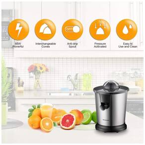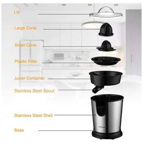 O espremedor de citrinos escolhe o aço inoxidável escovado profissional como material para o corpo principal. Motor poderoso, mas silencioso. Polpa zero, sistema de filtração eficiente que elimina todos os caroços e polpa para um suco puramente suave e cheio de nutrientes. Com sistema de sensor de pressão e cones de tamanho duplo o espremedor de citrinos elétrico da Homeleader possui dois cones, o grande cone adequado para frutas maiores, como laranja e toranja, o menor é para limão e limões. Com um toque, você pode iniciar e parar. O cone rotativo foi projetado para extrair e extrair o máximo de suco possível. Design conveniente Operação silenciosa do motor e bico anti gotejamento. Deslize para baixo da janela para conter o suco ou levante e deixe fluir diretamente para o copo ou a garrafa. O sistema de filtragem eficiente elimina todos os caroços e polpas para obter um suco puramente suave e repleto de nutrientes. Limpeza fácil o espremedor de citrinos elétrico da Homeleader encaixa todas as peças facilmente dentro de si para facilitar o zenamento, mas pode ser desmontado rapidamente para facilitar a limpeza você adorará ter nosso prático espremedor de citrinos elétrico premium em sua cozinha